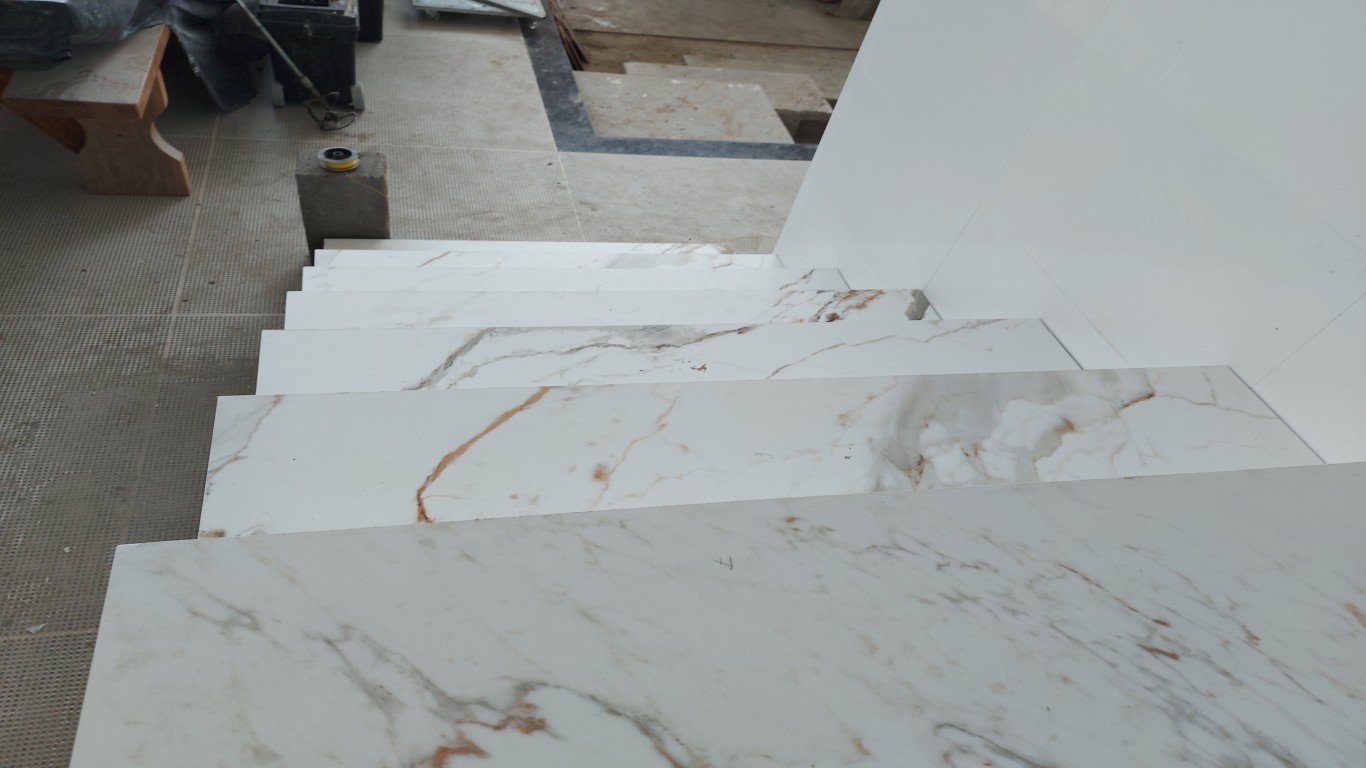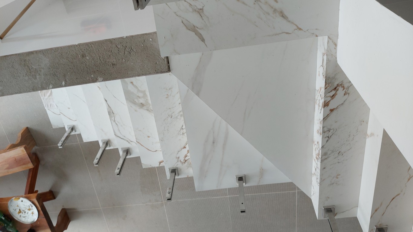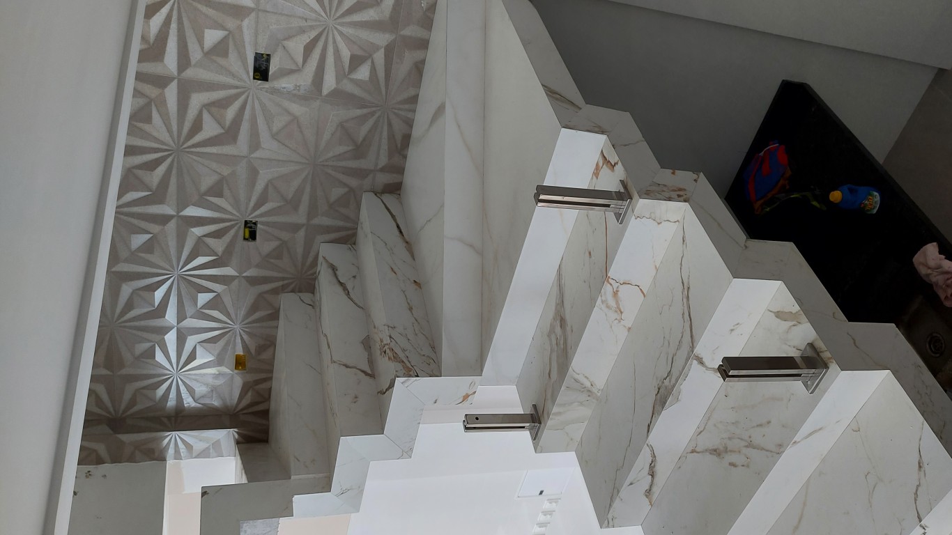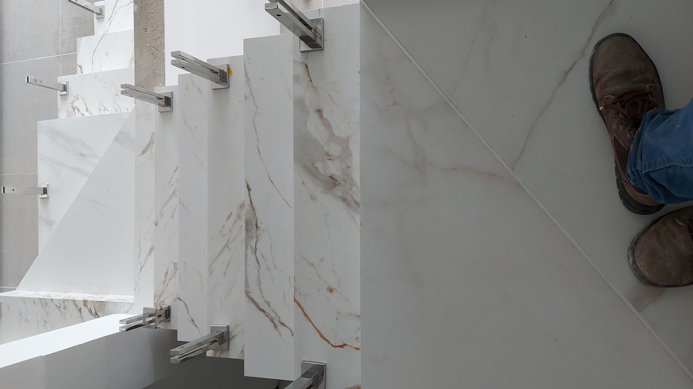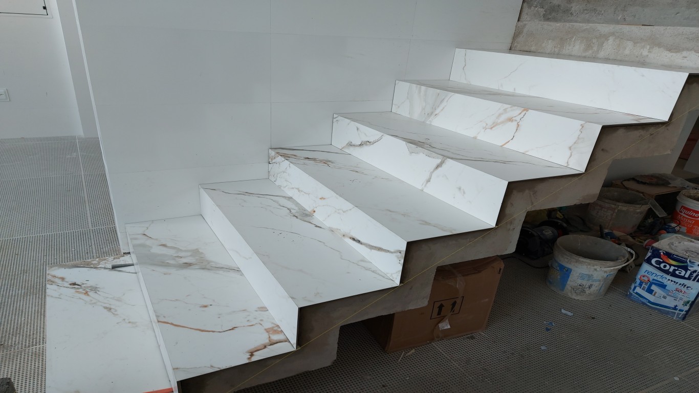 ESCADA EM PATAMARES REVESTIDA COM PORCELANATO CALACATA