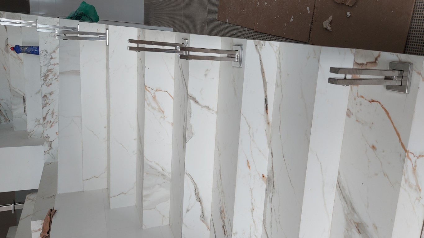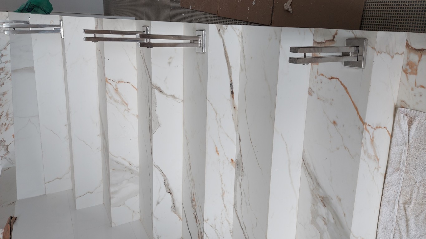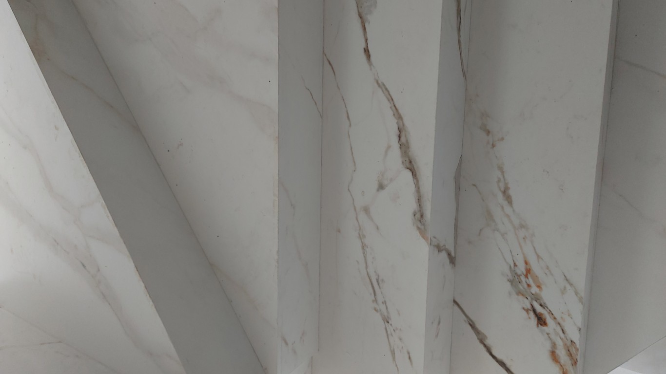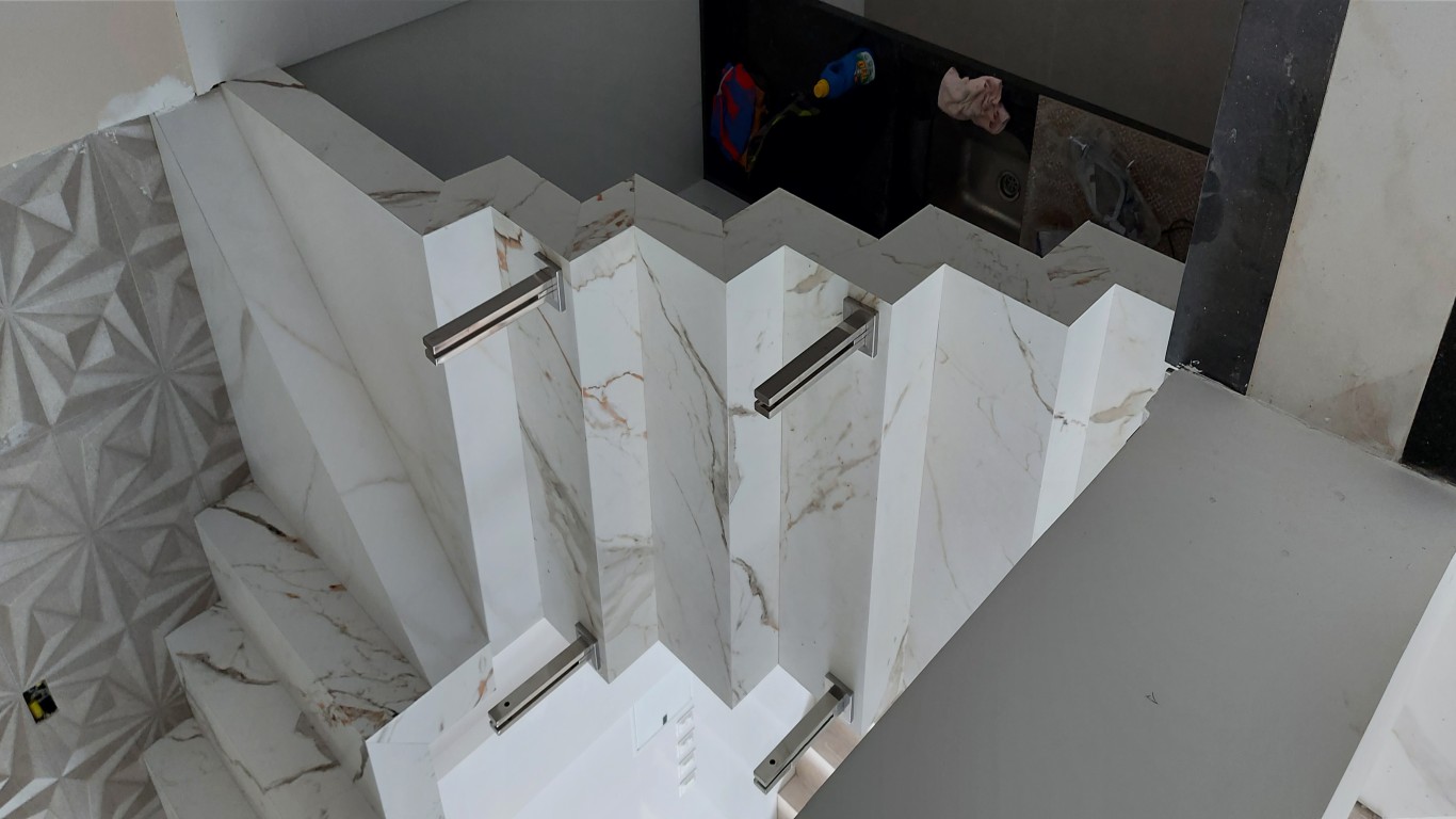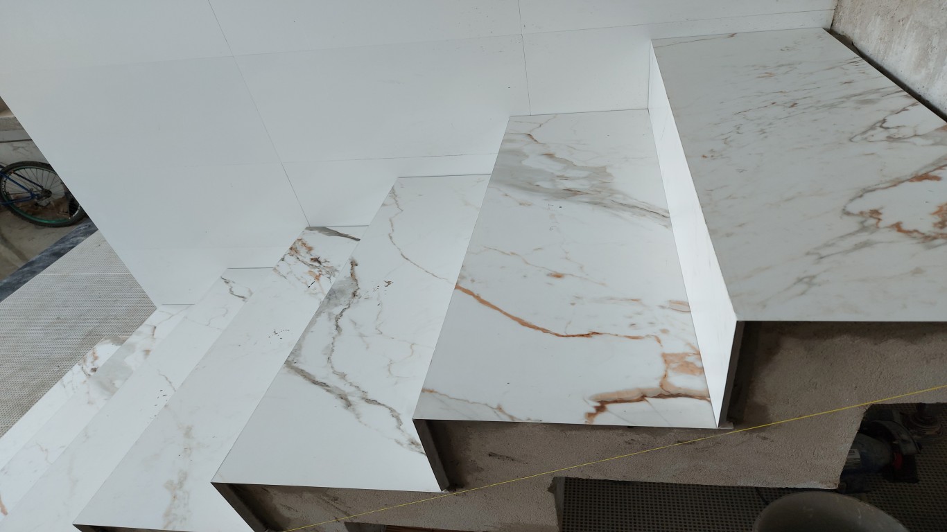 ESCADA EM PATAMARES REVESTIDA COM PORCELANATO CALACATA