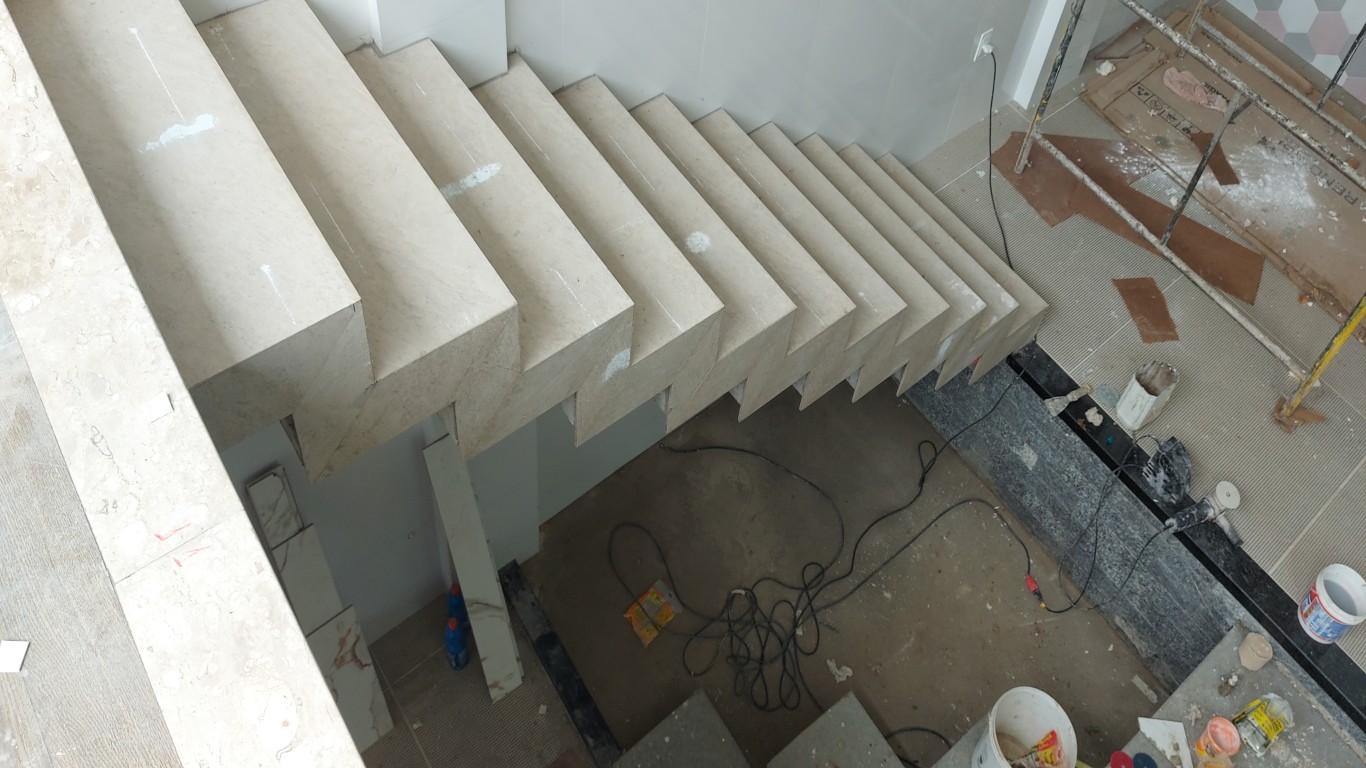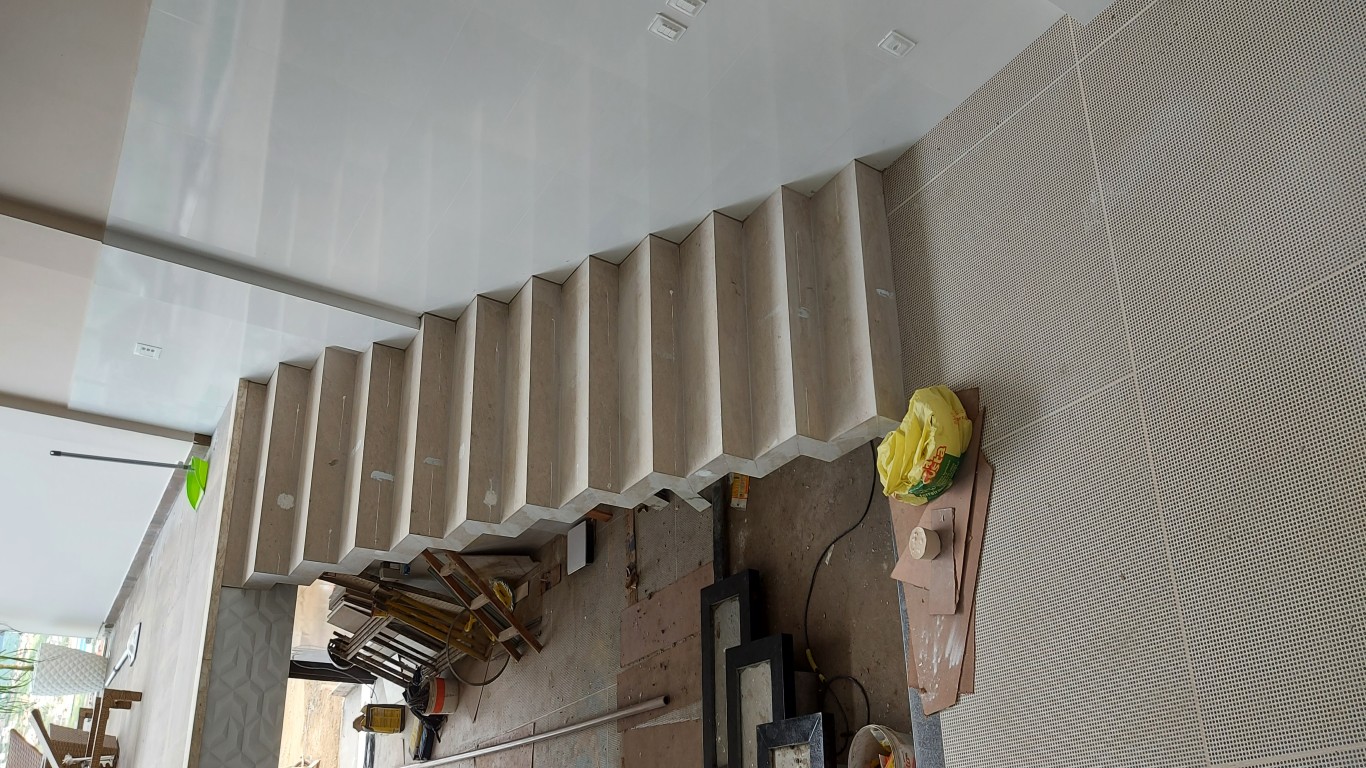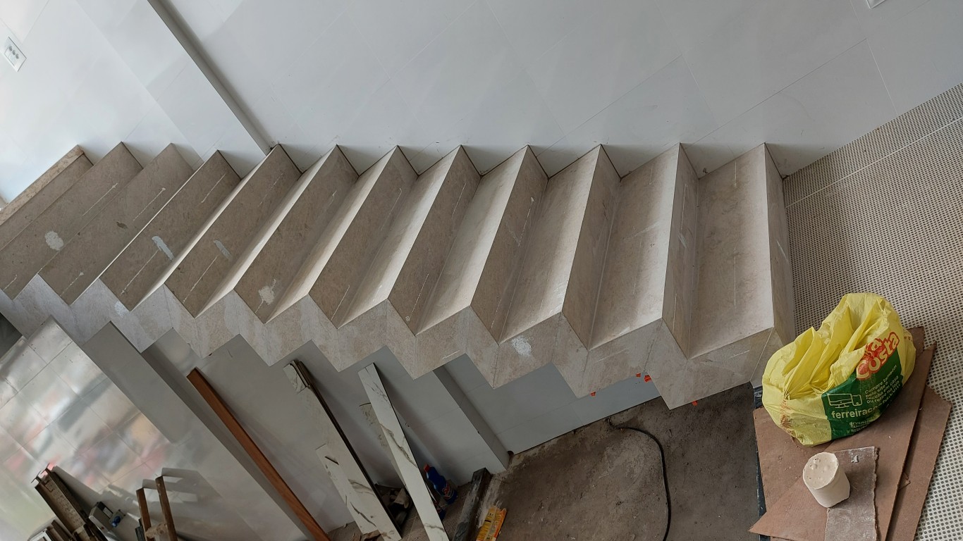 ESCADA RETA REVESTIDA COM O PORCELANATO BEGE PORTINARI