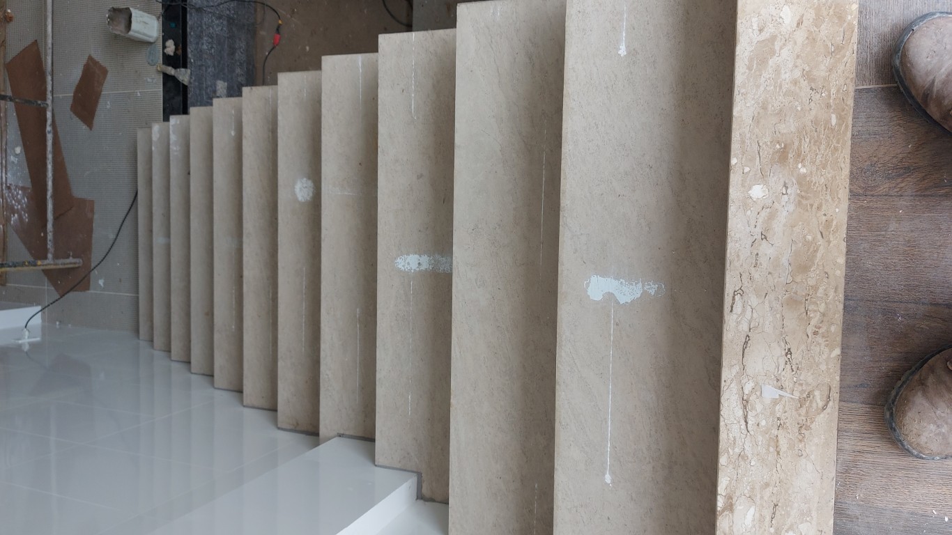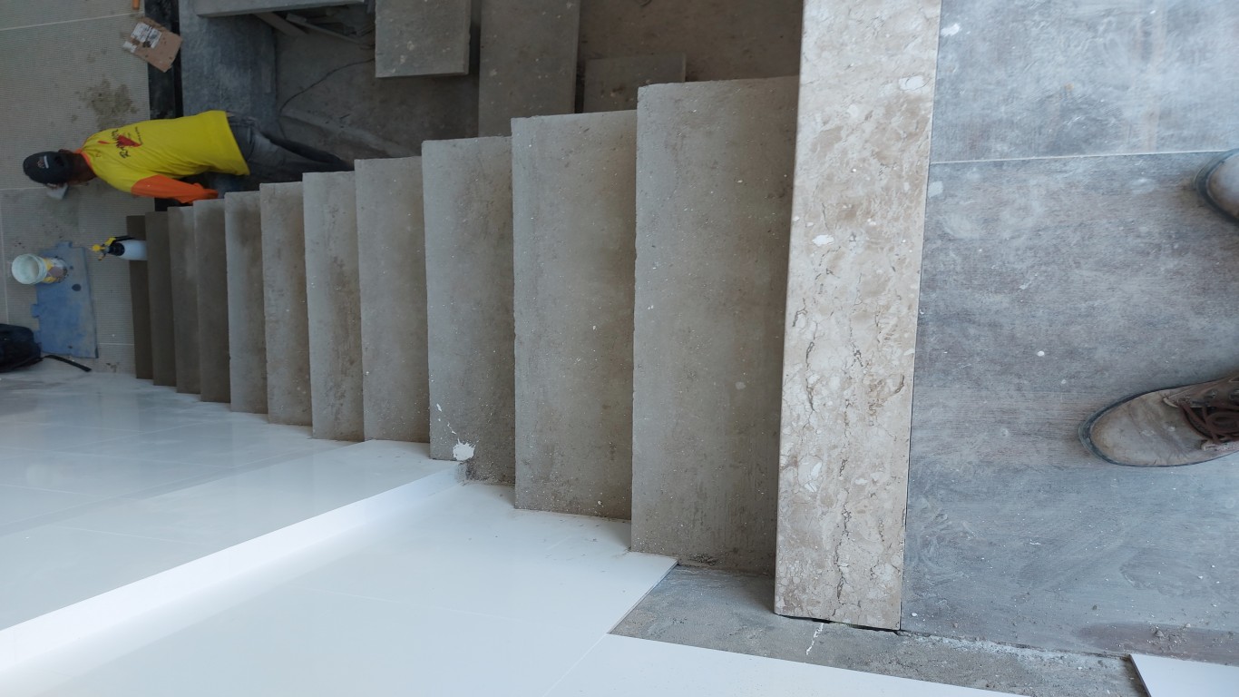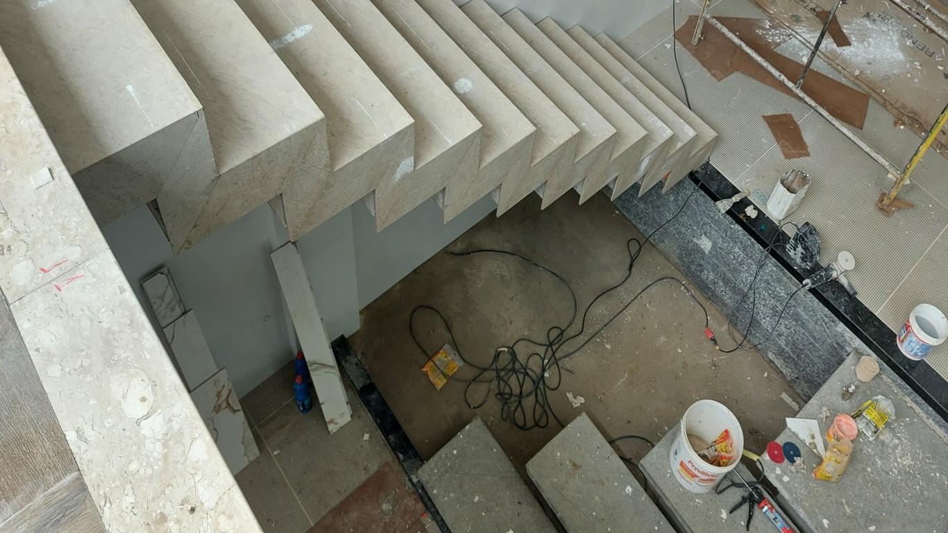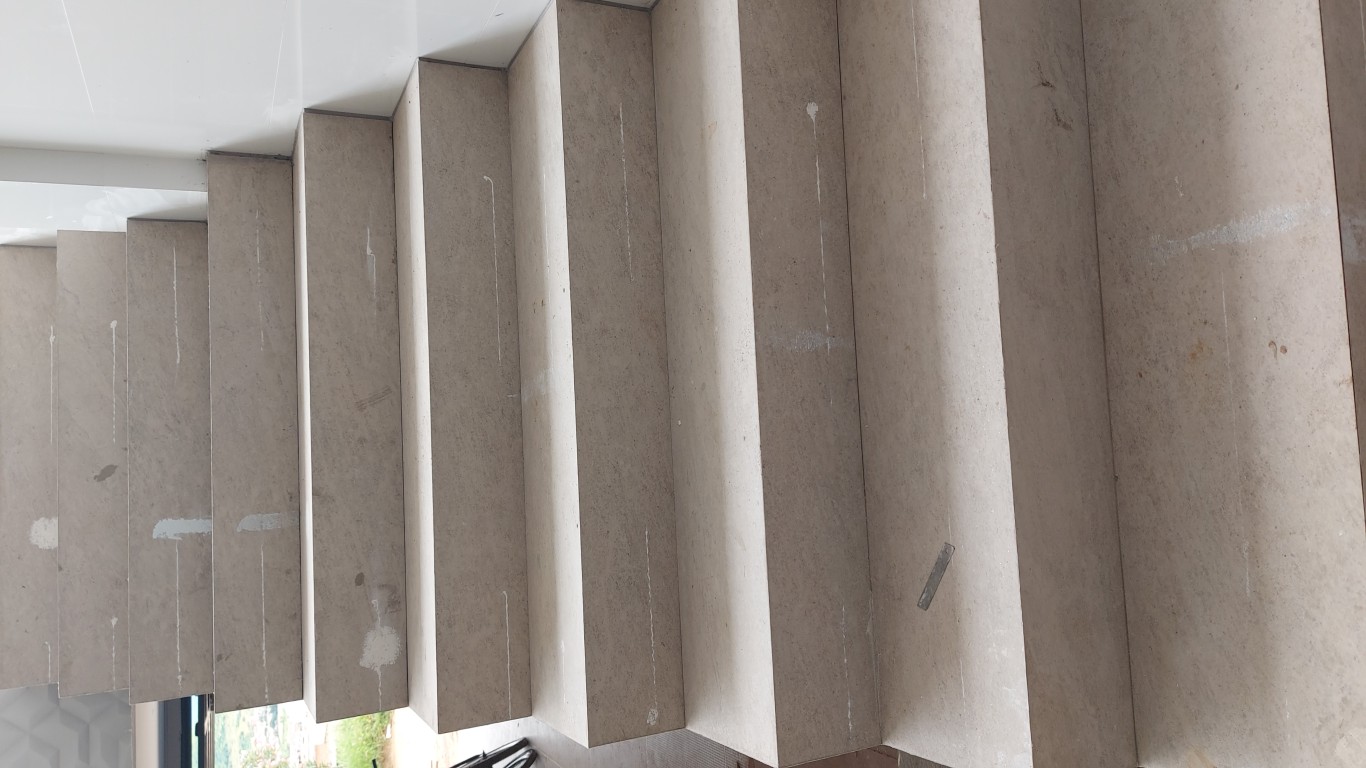 ESCADA RETA REVESTIDA COM O PORCELANATO BEGE PORTINARI