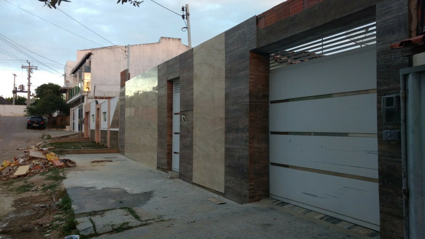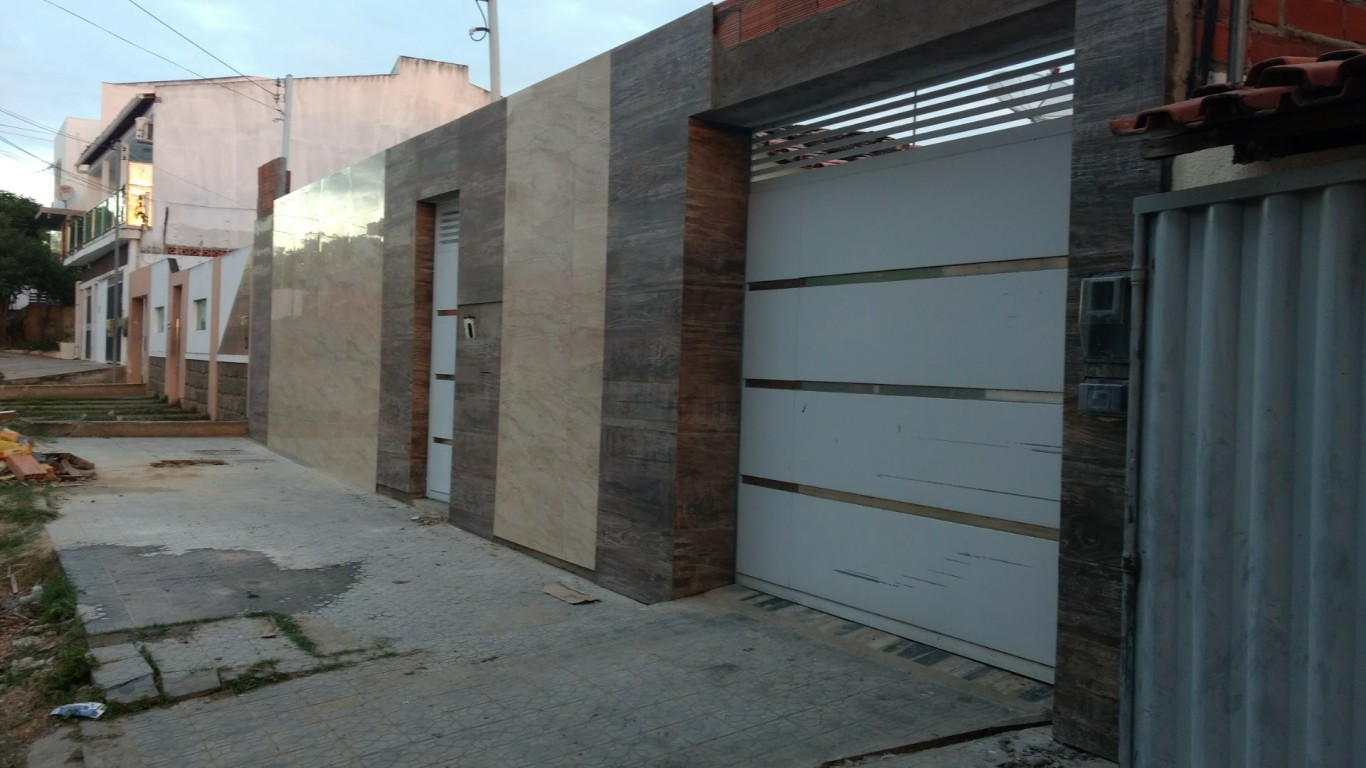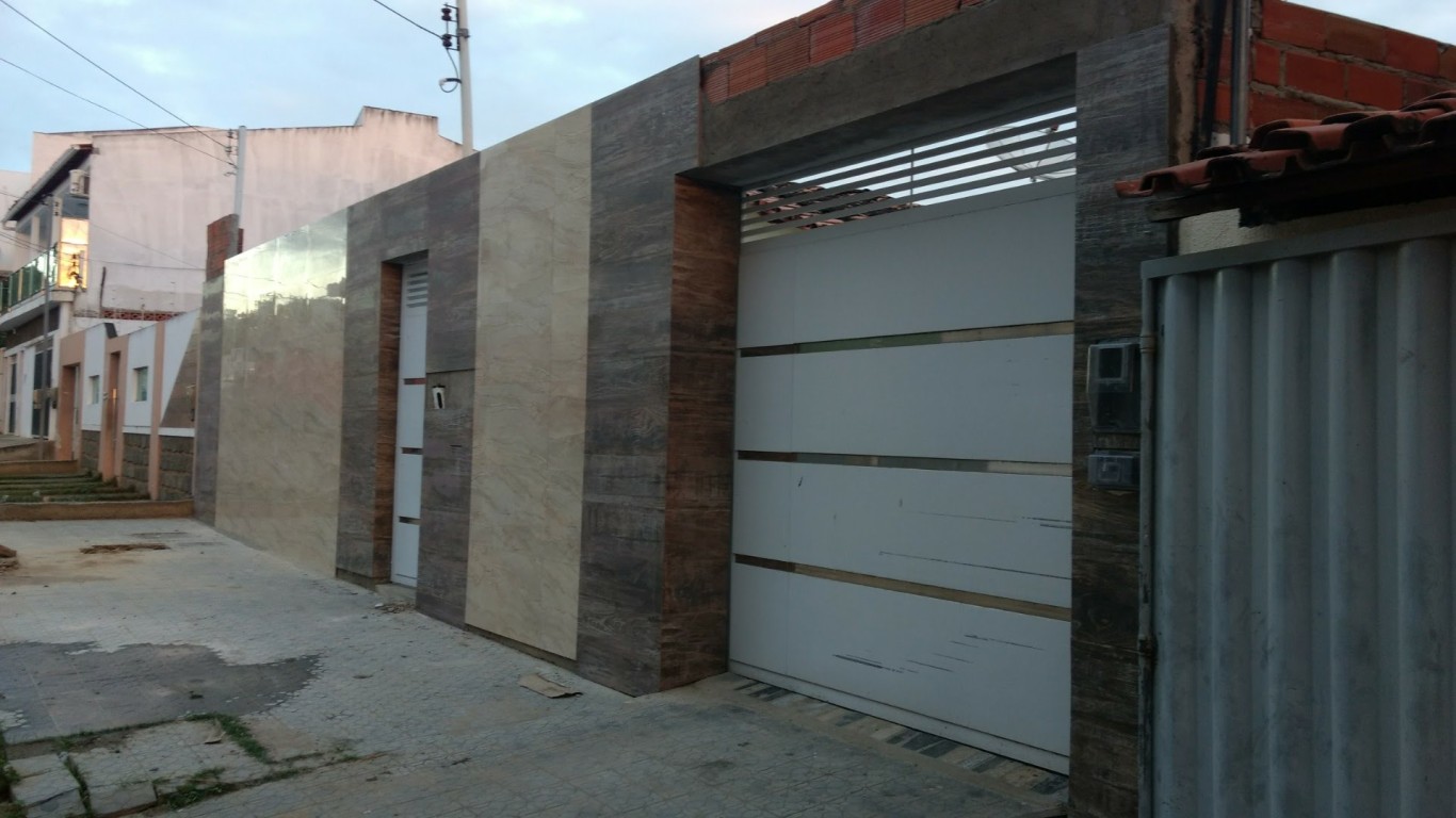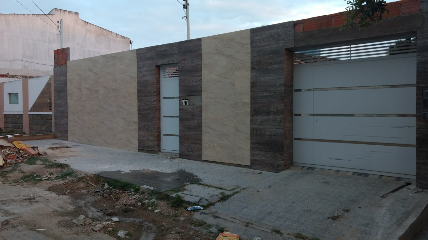 FACHADA REVESTIDA EM PORCELANATO BEGE COM REGUAS MADEIRATO
